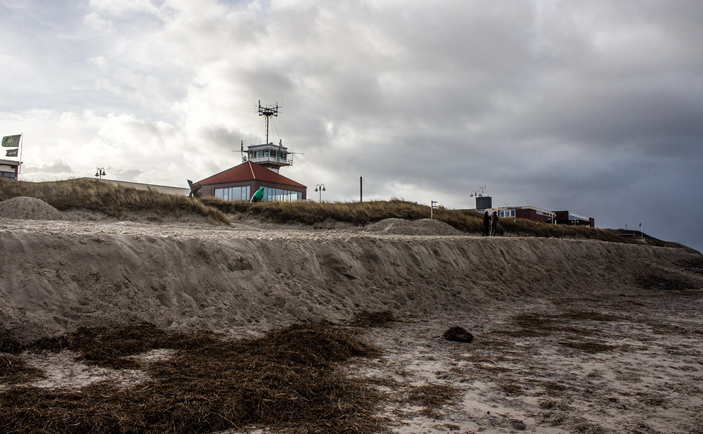 Eine Sturmflut hat am Hauptstrand eine Abbruchkante hinterlassen, außerdem befindet sich jede Menge Teek am Strand.