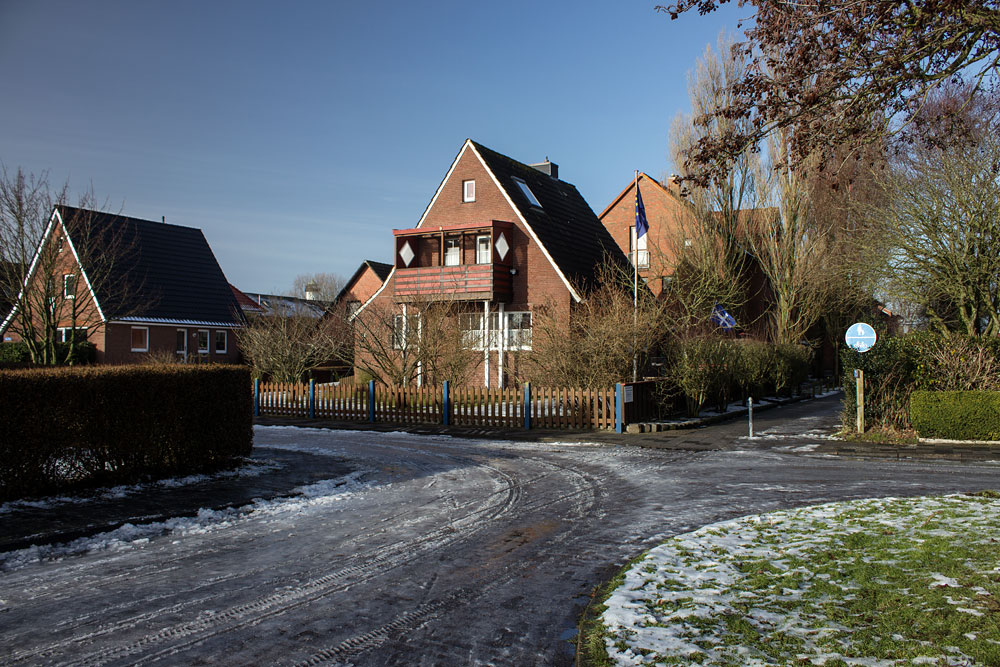 An dieser Stelle im südlichen Inseldorf treffen mehrere Wege und Straßen aufeinander, letztere sind von einer festgefahrenen Schneedecke bedeckt.