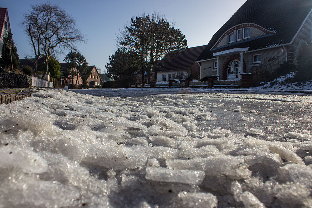 Zwar taut es bereits, doch vereister Schnee ist hier in der »Charlottenstraße« weiterhin zuhauf zu finden.