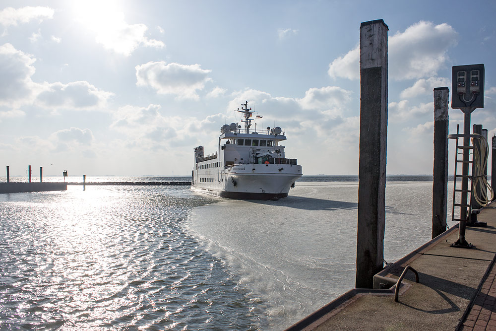 Das Motorschiff »Wangerooge« ist am Westanleger eingetroffen. Nun noch eine 180-Grad-Wende vollziehen, dann kann das Schiff an der Kaimauer festmachen.