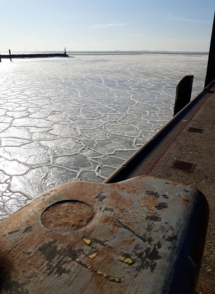 ‹ Im Hafenbecken des Westanlegers hat sich innerhalb eines Tages aufgrund des eingestellten Fährverkehrs eine geschlossene Eisdecke gebildet, die Umrisse der einzelnen Eisschollen sind dabei klar erkennbar.