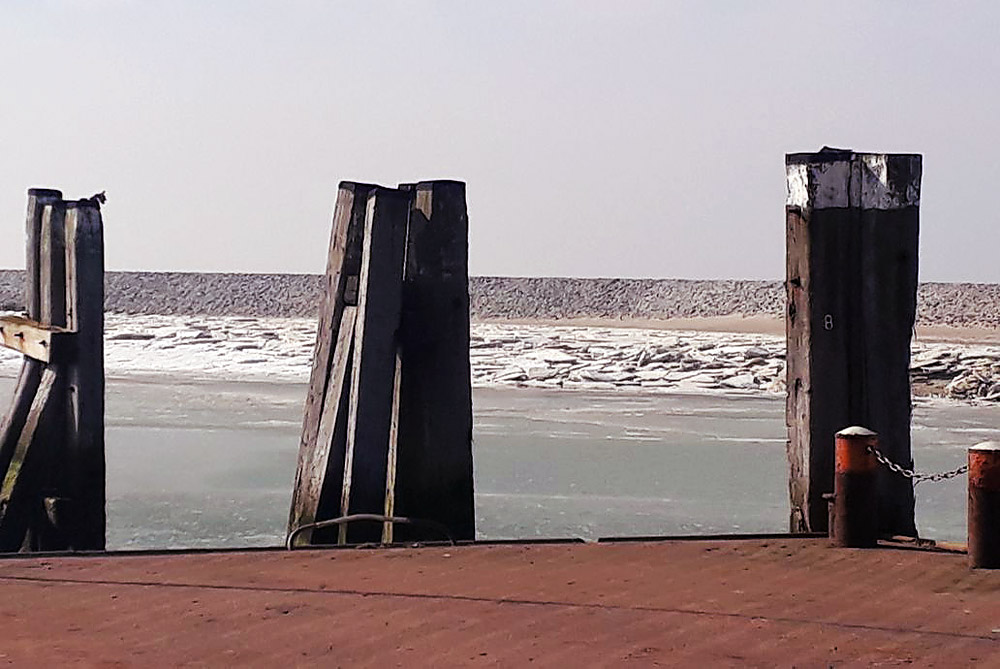 Im westlichen Hafenbecken des Wangerooger Anlegers hat sich eine Eisschicht gebildet, die bei Hochwasser auf den Strand gedrückt wird. Aus diesem Grund befinden sich zwischen Becken und Buhne »W« zahlreiche Eisschollen.
