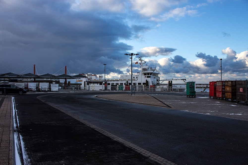 Am Hafen Harlesiel wartet bereits die Fähre, die um 17:30 Uhr in Richtung Wangerooge ablegen wird. Die ursprüngliche Abfahrt um 15:50 Uhr entfiel aufgrund des Ostwind-bedingten Niedrigwassers, die Wassertiefe in der Fahrrinne hätte zu dem Zeitpunkt noch nicht ausgereicht.
