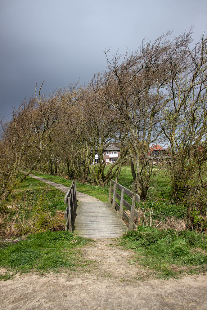 ‹ Dunkle Wolken ziehen übers Land, doch Schauer sind an diesem Tag eher die Ausnahme als die Regel. An diese Brücke unterhalb der Deichtreppe schließt sich der »Fußweg zum Deich« an, der von hier aus betrachtet aber eher »Fußweg zum Dorf« heißen müßte.