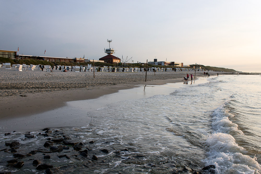 Es ist gerade Hochwasser, das Wasser reicht bis an die Volleyballfelder heran. Im Hintergrund das Strandkorb-Westfeld, die Signalstation und das Kurmittelhaus.