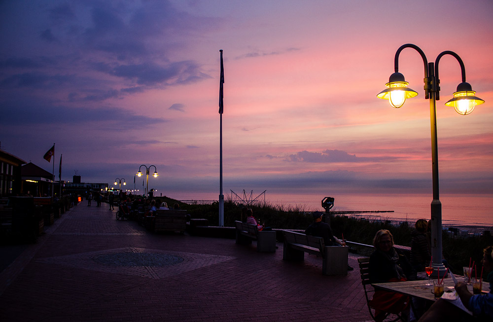 Soeben ist die Sonne untergegangen, die Strandpromenade wird in ein eigentümliches, lila-gelbes Licht getaucht.