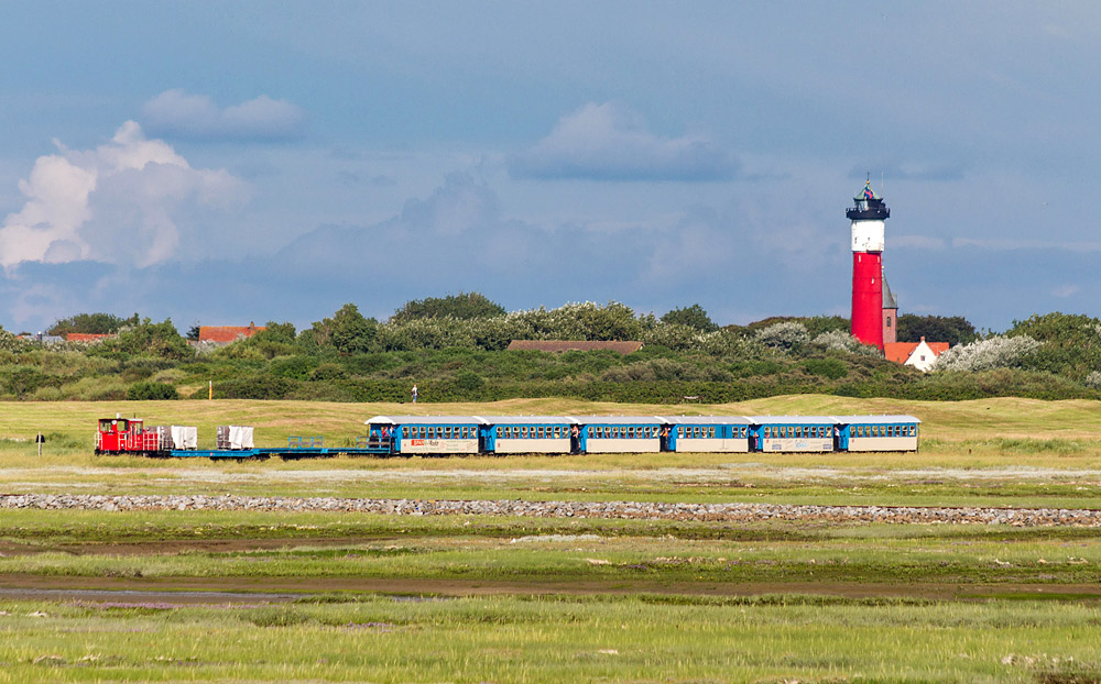 Eine ziemlich voll besetzte Inselbahn ist auf dem Weg vom Bahnhof zum Anleger, sie durchfährt gerade die Salzwiesen des Deichvorlandes. Der Leuchtturm im Hintergrund befindet sich mitten im Dorf zwischen zahlreichen Häusern, von denen man aufgrund des üppigen Baumbestandes aber kaum etwas sieht.