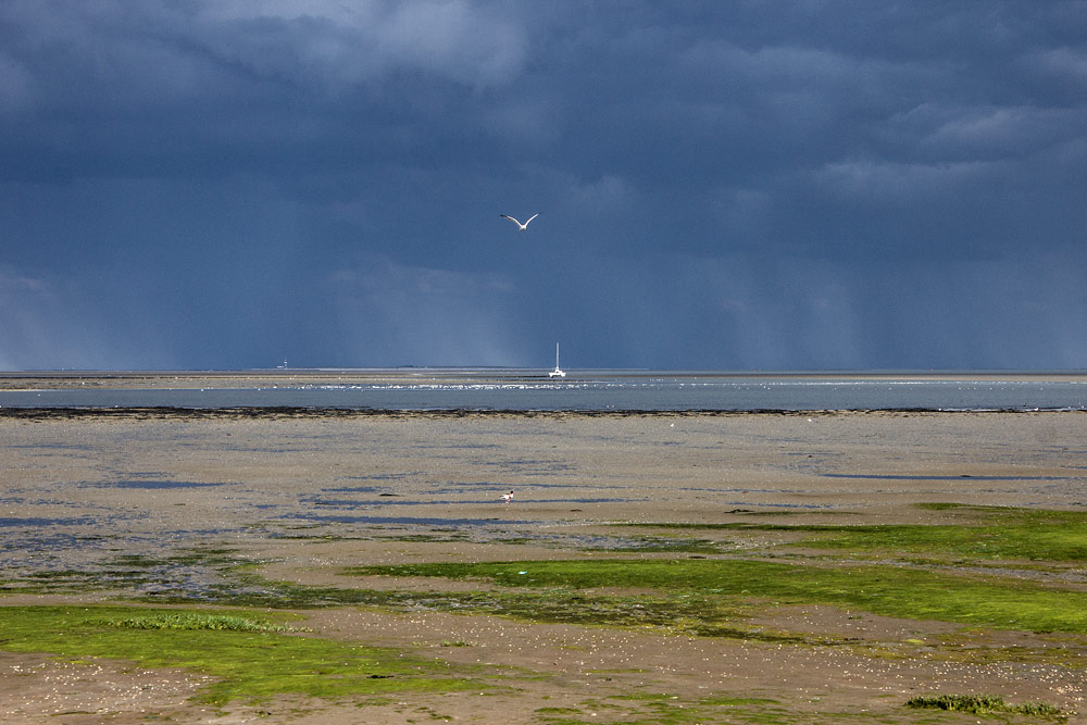Dunkle Gewitterwolken ziehen übers Wattenmeer, in dem jetzt bei Niedrigwasser lediglich noch einige Priele Wasser führen, so zum Beispiel das »Bootstief« in der Bildmitte. Etwas weiter hinten liegt ein trocken gefallener Katamaran, der erst in etwa zwei Stunden wieder Wasser unterm Kiel haben dürfte.