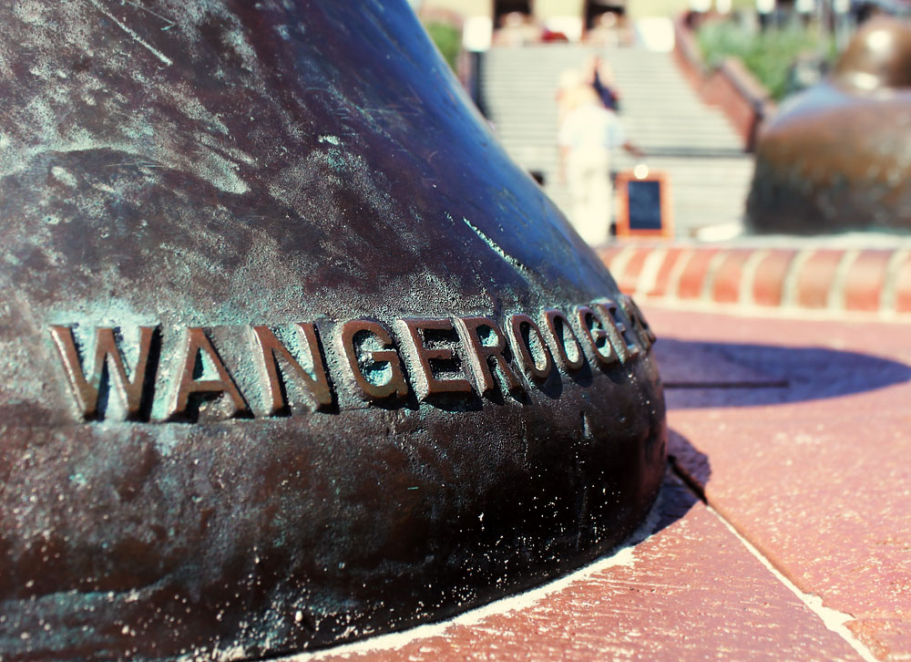 Zu der Seehund-Skulptur in der oberen »Zedeliusstraße« gehören auch einige Poller. Dieser ist u. a. mit »Gemeinde Wangerooge« beschriftet.