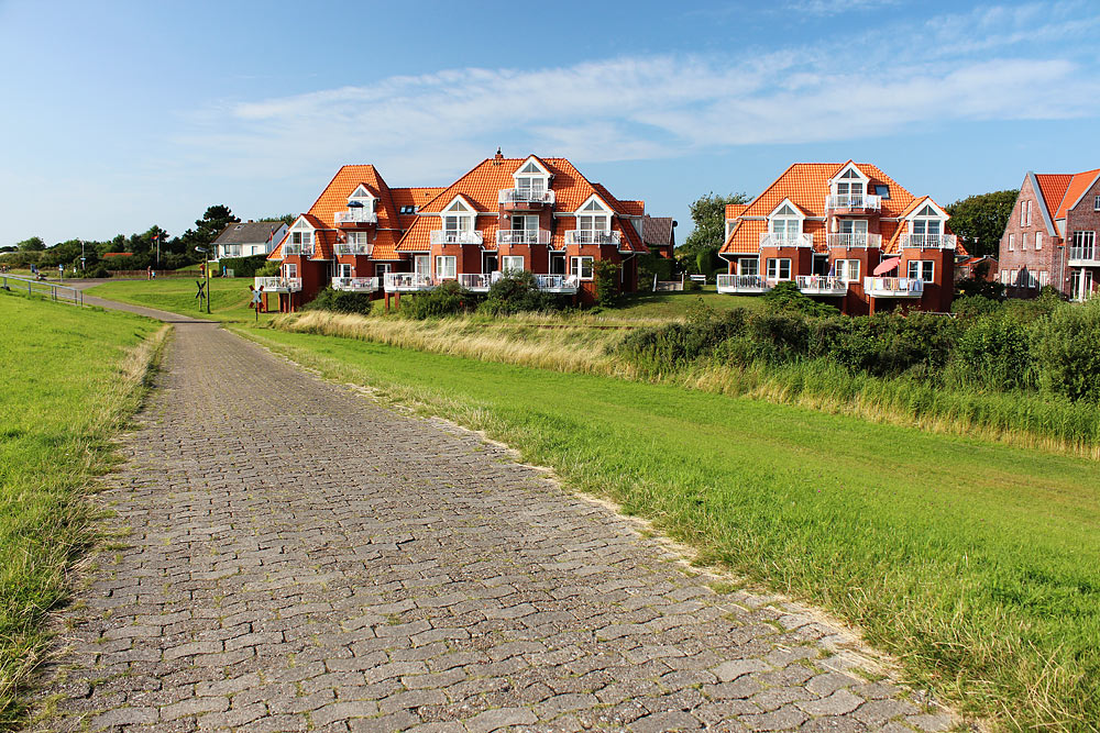 Blick vom Dorfgrodendeich auf die Häuser der »Lagune am Wattenmeer«, die mit ihren orange-roten Dächern bereits vom Westanleger deutlich ins Auge fallen.