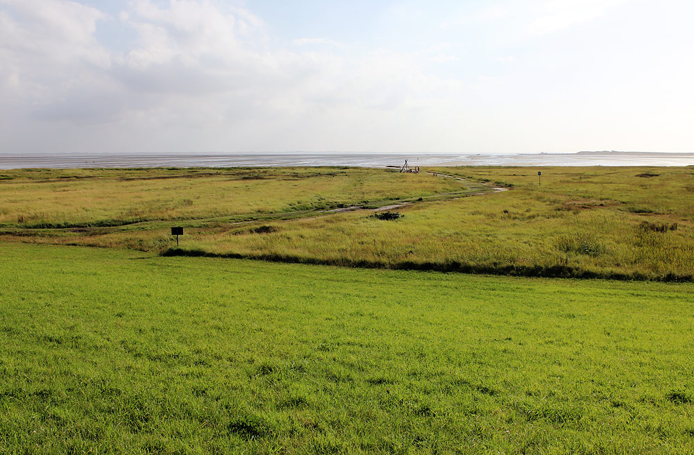 Hier sehen wir den einzigen Bereich der Salzwiesen, der nicht zur »Ruhezone« des Nationalparks gehört, sondern zur weniger streng geschützten »Zwischenzone«. Grund ist der »Georgspad«, der an dieser Stelle verläuft, hier gelangen beispielsweise die Teilnehmer von Wattwanderungen zum Wattenmeer.