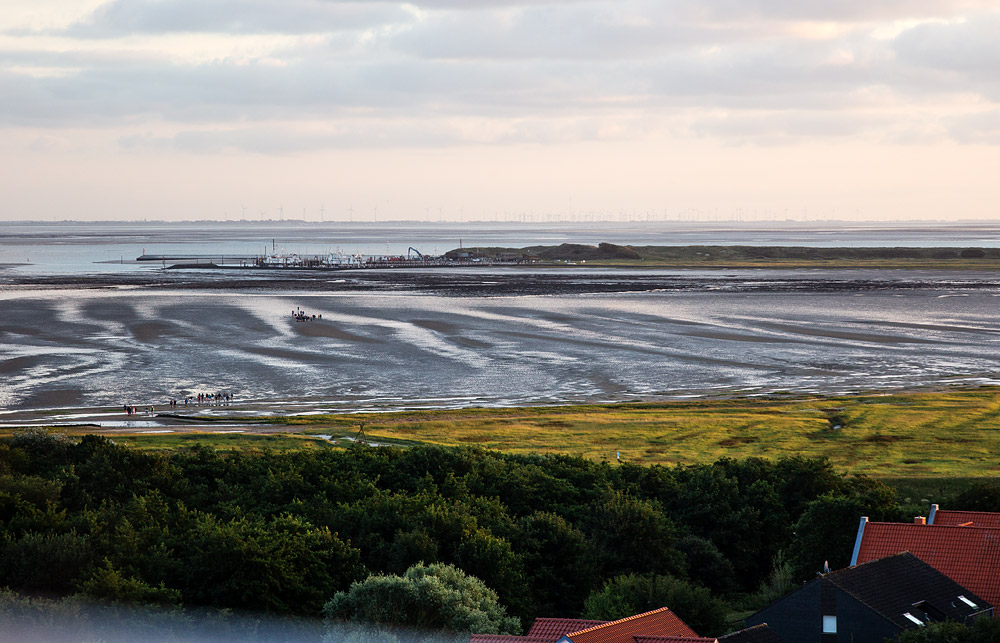 Vom Alten Leuchtturm hat man nicht nur einen guten Blick aufs Dorf, auch auf Salzwiesen, Watt und Westanleger kann man seinen Blick werfen. Gleich zwei Wattwander-Gruppen sind noch unterwegs, die einen kommen allerdings gerade wieder.