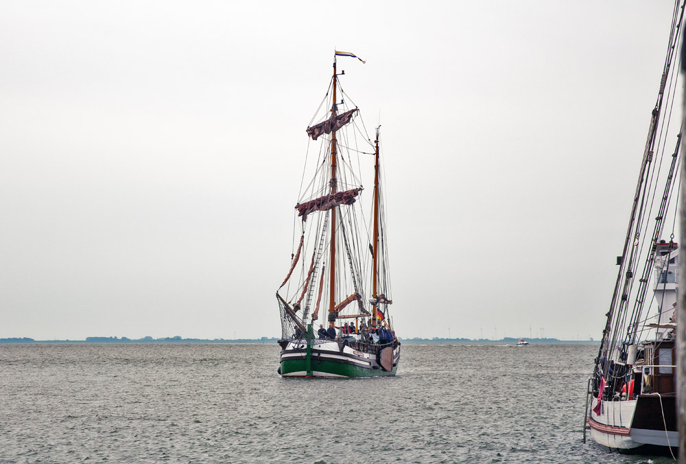 Die »Gesine von Papenburg« ist eine Rekonstruktion einer historischen Schmack von 1985. Gerade trifft sie am Wangerooger Westanleger ein, wo sie in Kürze festmachen wird.