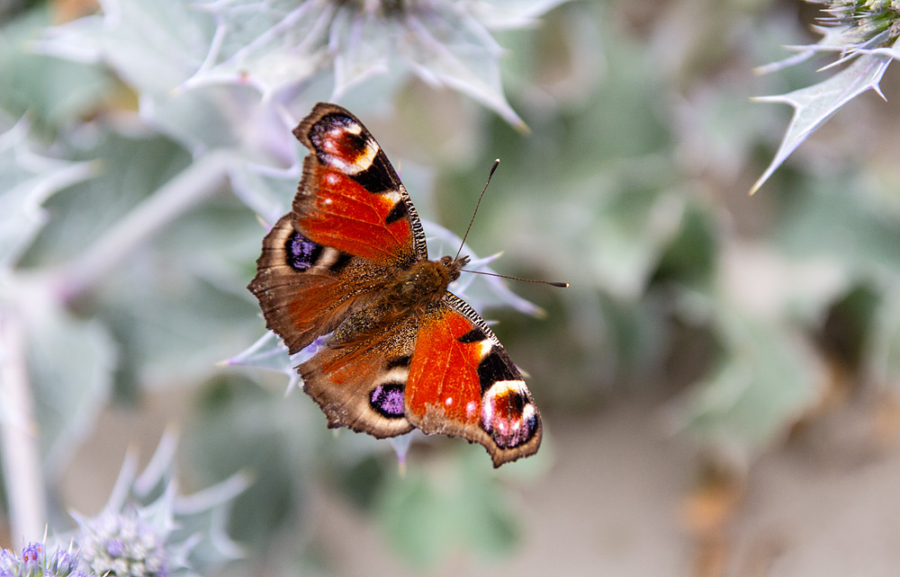 Tagpfauenaugen lieben Stranddisteln, hier sitzt ein schönes Exemplar auf einer der Blüten.