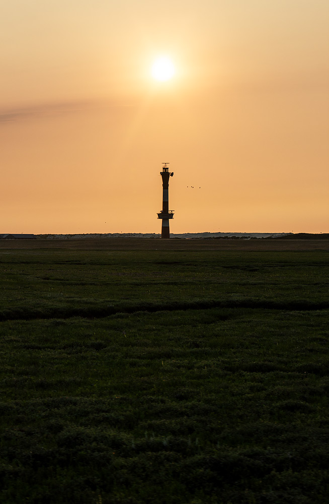 ‹ Neuer Leuchtturm und Sonne sind, während wir noch immer mit der Inselbahn durch die Salzwiesen fahren, nun auf einer Linie.