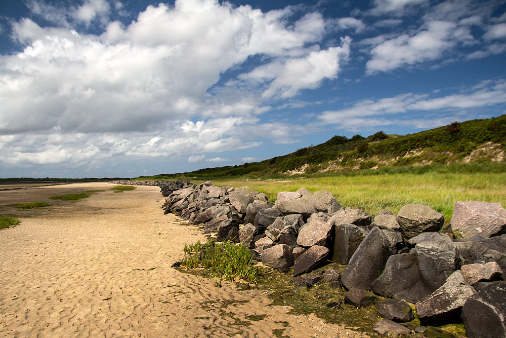 Dieser Steindamm wurde vor vielen Jahren am südlichen Fuß der Ostdünen errichtet. Er schützt die Dünen vor Sturmfluten und größeren Abbrüchen.