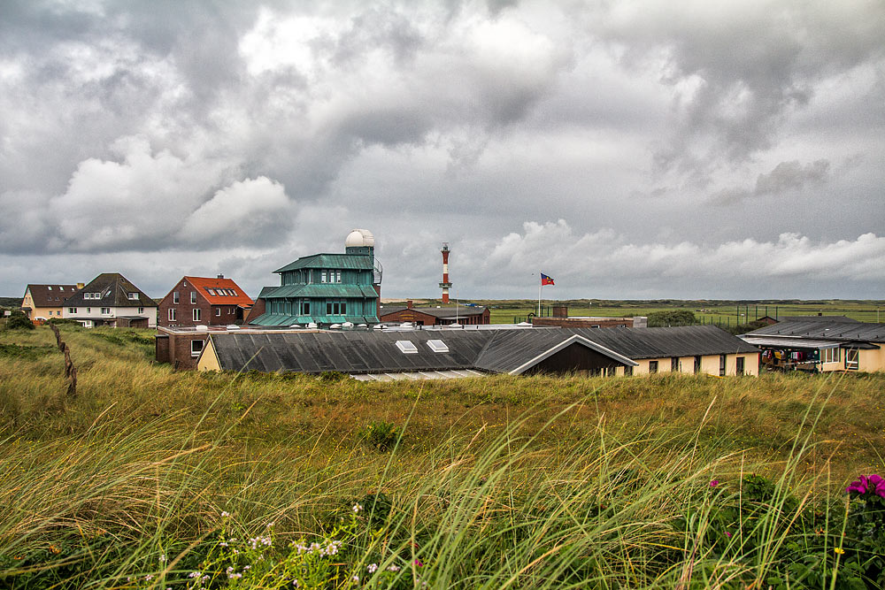 Ein Blick auf zwei Schullandheime, die sich im Westdorf befinden: Vorn das »Inselheim Rüstringen«, zu dem auch das Gebäude mit Sternwarte etwas weiter hinten gehört sowie dahinter, auf gerader Linie zwischen dem Fotostandort und dem Neuen Leuchtturm, das »Inselheim Schalksmühle«.