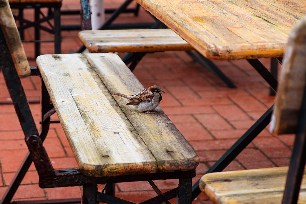 Ein kleiner Spatz hat auf einer der Bierbänke, die im Biergarten des Westturm-Cafés stehen, Platz genommen.