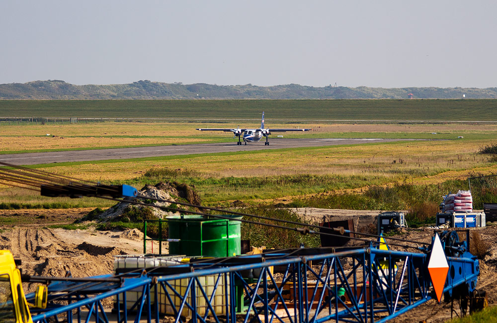 Gerade erst ist ein Flugzeug der »FLN« gelandet, schon startet ein anderes, diesmal ist es die Maschine mit dem Kennzeichen »D-IEST«. Vorn die Baustelle, die im Zuge der Deicherhöhung eingerichtet wurde.
