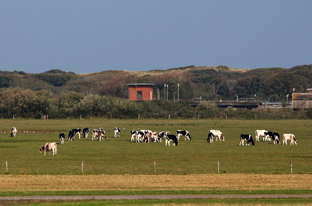 Auf einer Weide im Ostinnengroden grasen einige junge Rinder, die jedes Jahr in den Sommermonaten auf der Insel weilen. Im Hintergrund erkennt man die Kläranlage.
