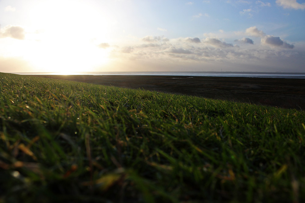 Grünes Gras auf dem Ostgrodendeich im Gegenlicht.