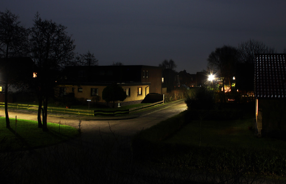 Es ist mittlerweile tiefste Nacht, hier ein Blick auf die Straße »Im Dorgroden« hinab, die von den LED-Straßenlaternen erhellt wird.