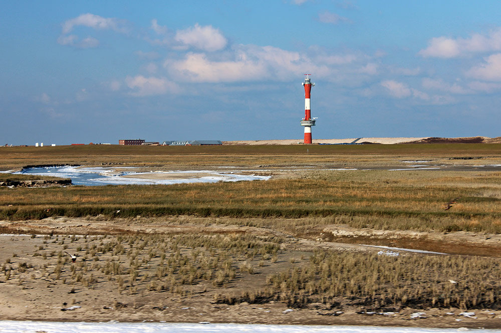 Blick von der Inselbahn auf die Salzwiesen, die sich im Westaußengroden befinden. Hinten sehen wir außerdem den Neuen Leuchtturm.