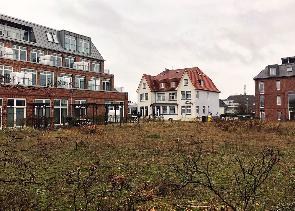 Zwischen dem neuen Aparthotel Anna Düne und der Gemeinde- und Kurverwaltung befindet sich ein Stück Brachland, früher ein Teil des Cobigolf-Platzes. In der Bildmitte sehen Sie außerdem das Haus Seeblick, welches zum Aufnahmezeitpunkt Ende November 2018 zum Verkauf steht.