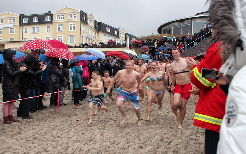 Das Jahres-Abbaden fand 2017 in strömendem Regen statt, dafür war es nicht allzu kalt. Dennoch interessant zu sehen, wie es die Teilnehmer kaum erwarten können, sich in die eisigen Fluten zu stürzen.