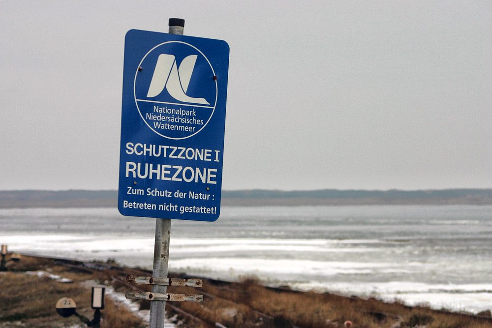 Die Schilder des Nationalparks sehen mitterweile ein wenig anders aus, doch an der Grundaussage, dass man die Ruhezone nicht betreten darf, hat sich natürlich bis heute nichts geändert. Im Hintergrund ist die Salinebucht zu erkennen, welche zum Teil von Meereis bedeckt ist.