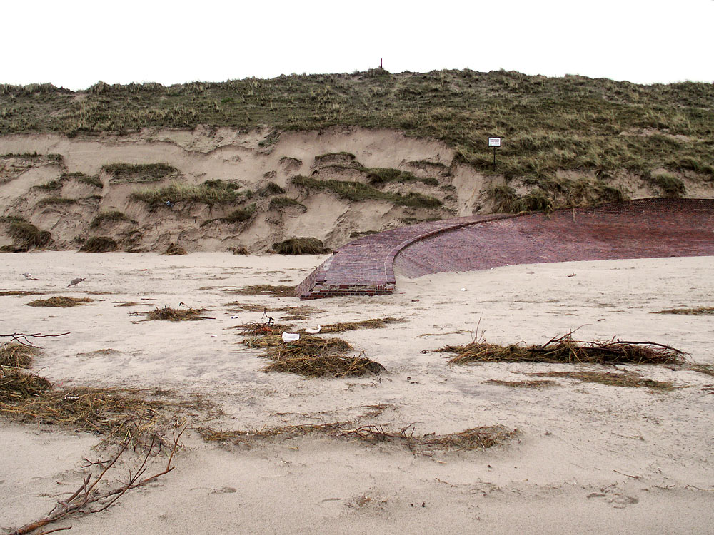 Bis fast zum Bootsweg reicht die Strandmauer, die in diesem Bereich noch in ihrem geklinkerten Ursprungszustand vorhanden ist. Meistens ist kaum etwas von diesem Abschnitt zu erkennen, weil die Strandmauer normalerweise unterm Sand versteckt liegt. Nach der schweren Sturmflut Anfang November 2006 aber liegt sie komplett frei.