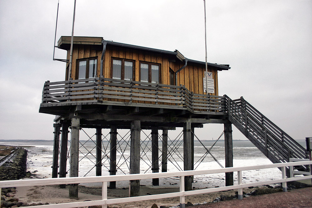 Wir sehen hier die Schiffsmeldestelle, die das nördliche Ende des Westanlegers markiert und dahinter das Wattenmeer mit der Salinebucht.
