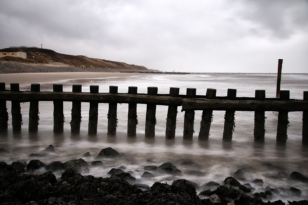 Blick von der Buhne »M« nach Westen. Nach einigen schweren Winterstürmen und den damit einhergehenden Fluten liegt im Bereich des Surfstrandes die Strandmauer frei, erst im Frühjahr wird dort neuer Sand aufgeschüttet.