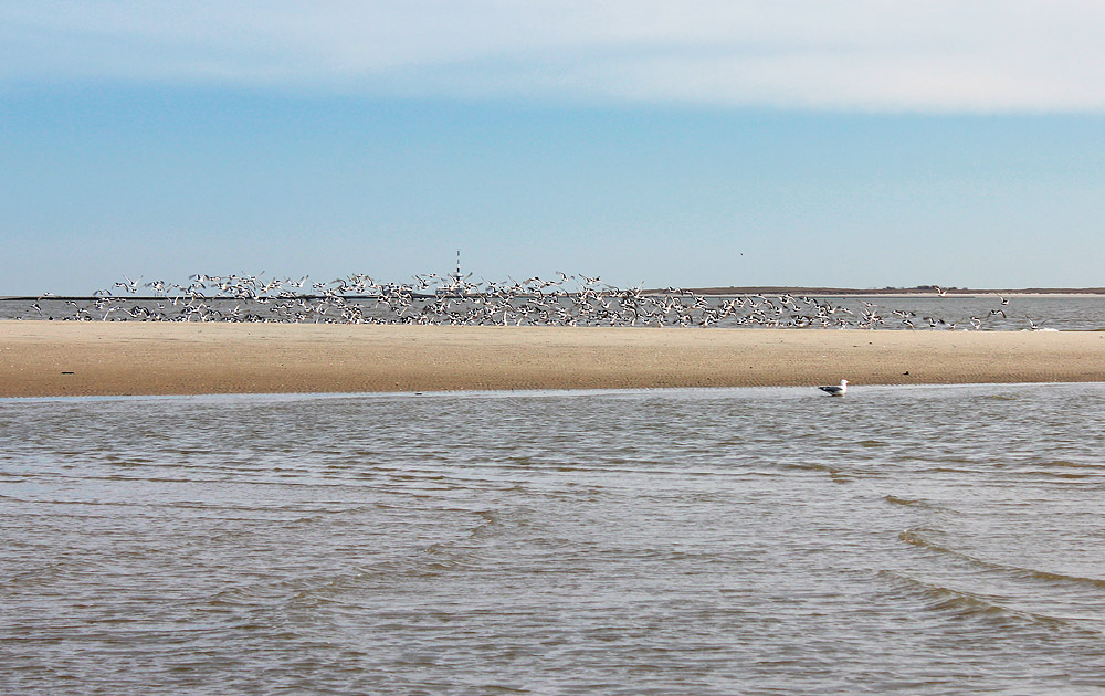 Ein Schwarm bestehend aus unzähligen Austernfischern ist gerade dabei, aufzufliegen.