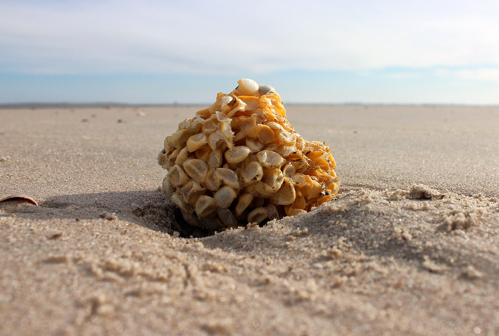 Ab und an findet man am Spülsaum faustgroße Klumpen, die aus zahlreichen Eikapseln der Wellhornschnecke bestehen. Jede der Kapseln enthält etwa 1000 Eier, von denen sich aber nur wenige weiterentwickeln, die restlichen Eier sind Nähreier.