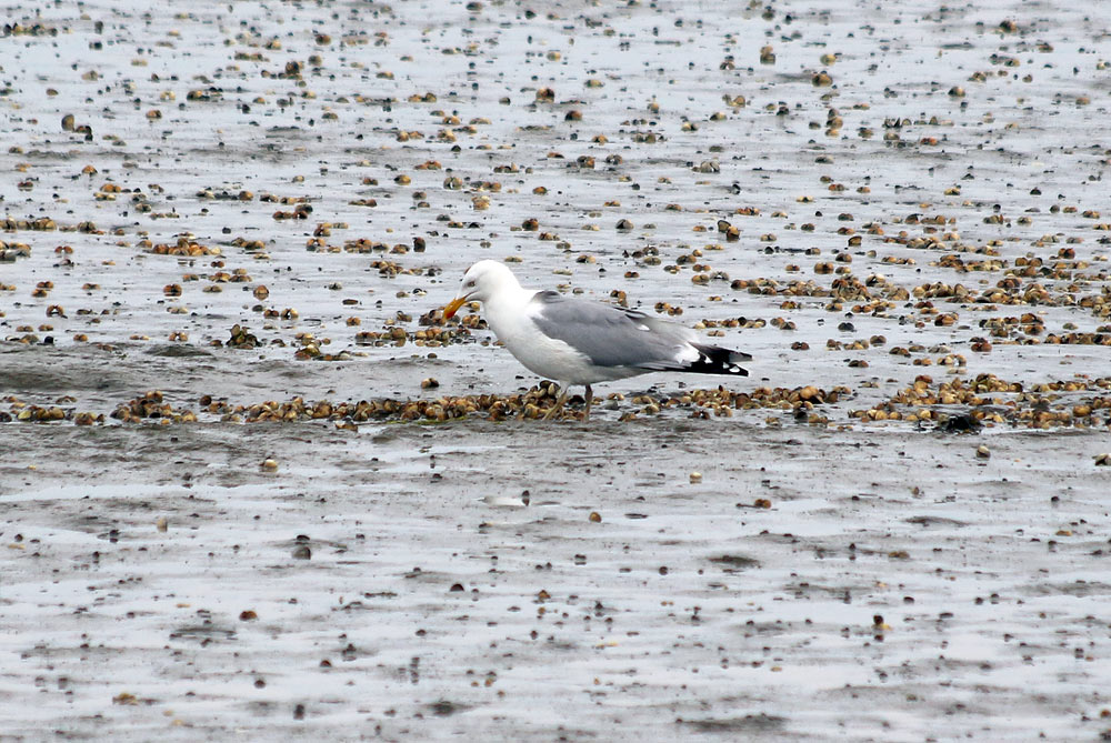 Eine Silbermöwe auf der Suche nach schmackhaften Herzmuscheln.
