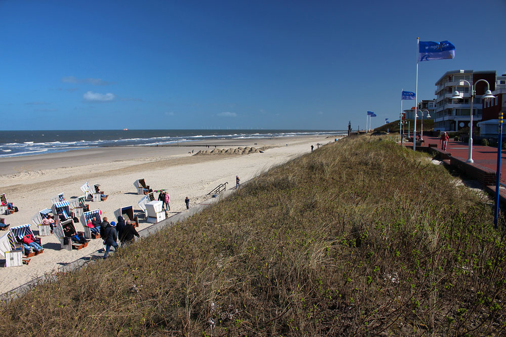 Ende März stand bereits eine stattliche Zahl an Strandkörben am Hauptstrand, allerdings aufgrund der Sandfahr-Maßnahmen zunächst nur im Westfeld bis etwa zum »Schulze-Steg« hin. Im Hintergrund erkennt man die Haufen des frisch angefahrenen Sandes.