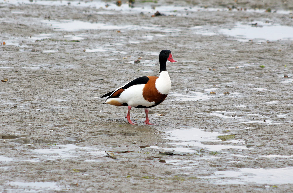 Eine Brandgans watschelt auf dem Wattboden umher. Brandgänse gehören zu den Halbgänsen, ähneln den Gänsen, zeigen aber auch Merkmale von Enten.