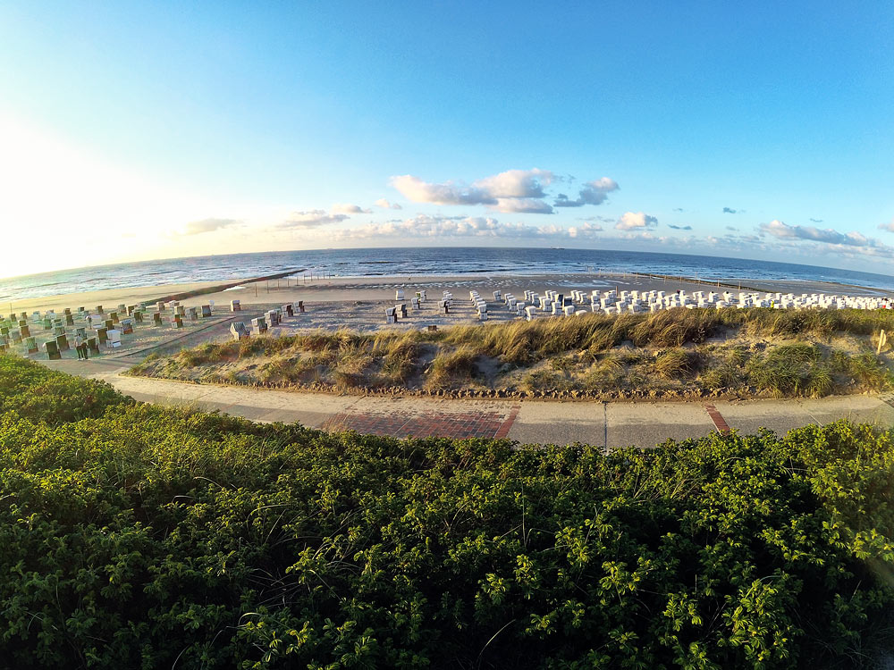 Wir stehen an der Strandpromenade und schauen an einem herrlichen Frühlingsabend auf den Strand und aufs Meer.