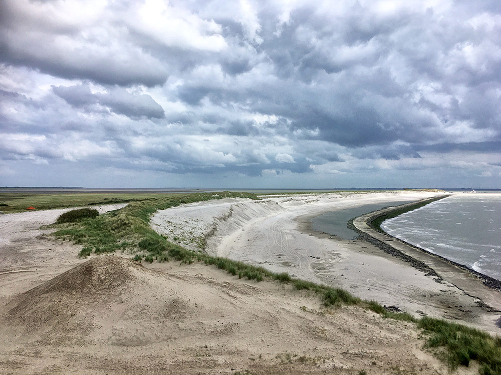 Beeindruckendes Wolken-Schauspiel über den Harle Hörn-Dünen im Westen der Insel. Ganz hinten rechts befindet sich der Westanleger, ganz links die Salzwiesen des Westaußengrodens.