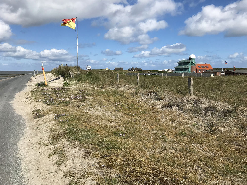 Der Bauzaun ist erst einmal wieder verschwunden, im Jahr 2019 kann man wieder normal auf dem Deckwerk laufen. Rechts das Inselheim Rüstringen mit Sternwarte.