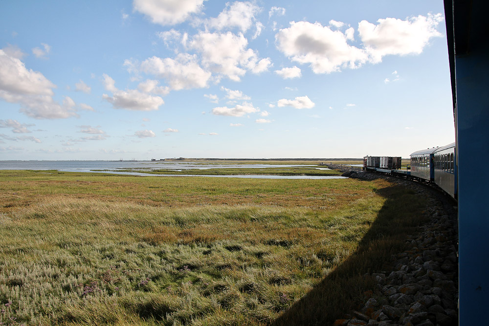 Weiter geht die Fahrt mit der Inselbahn in Richtung Westanleger, die Lok überquert gerade die erste Prielbrücke der Aalkuhlen.