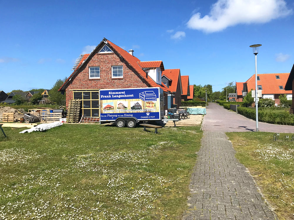 Bauplätze auf Wangerooge sind mittlerweile rar, daher werden Neubau-Vorhaben auf zuvor nicht bebauten Grundstücken immer seltener. Links aber sieht man eines dieser erst kürzlich erstellten Wohngebäude, laut Anhänger-Beschriftung ist dort derzeit der Zimmermann tätig.
