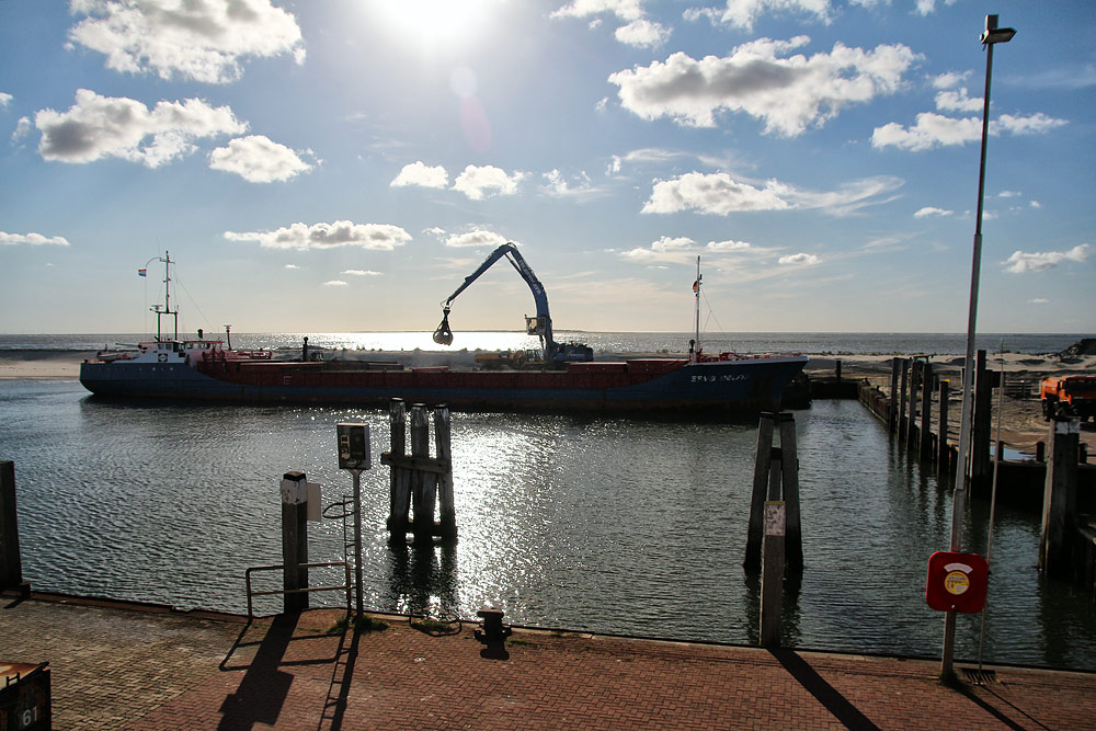 Gerade wird das niederländische Frachtschiff »Eems Delfia« am Anleger entladen. Bei jeder Fahrt bringt es etwa 1000 Tonnen Wasserbau-Steine direkt von Norwegen zur Insel.