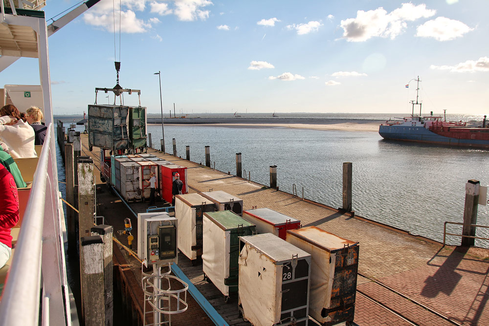 An der Anzahl der Gepäckcontainer kann man oft gut ablesen, wie voll eine Überfahrt ist bzw. wie hoch der Anteil der Tagesgäste ist. Wenn man die stattliche Anzahl so sieht, kommt man zum Ergebnis: Ziemlich voll und hauptsächlich Langzeit-Urlauber.
