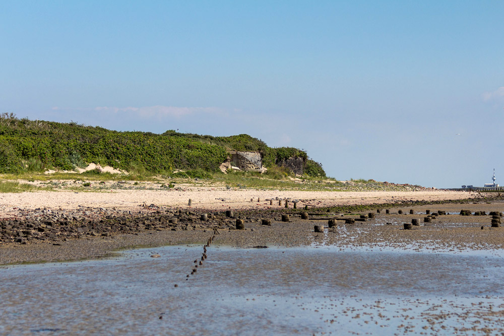 Bei Niedrigwasser fällt der Bereich südlich der Ostdünen trocken, nur einige Priele bleiben übrig. In den Ostdünen befanden sich zum Aufnahmezeitpunkt noch ein paar Bunkerreste, sie sind in der Bildmitte zu erkennen. Rechts der Radarturm »Minsener Oog Buhne C«.