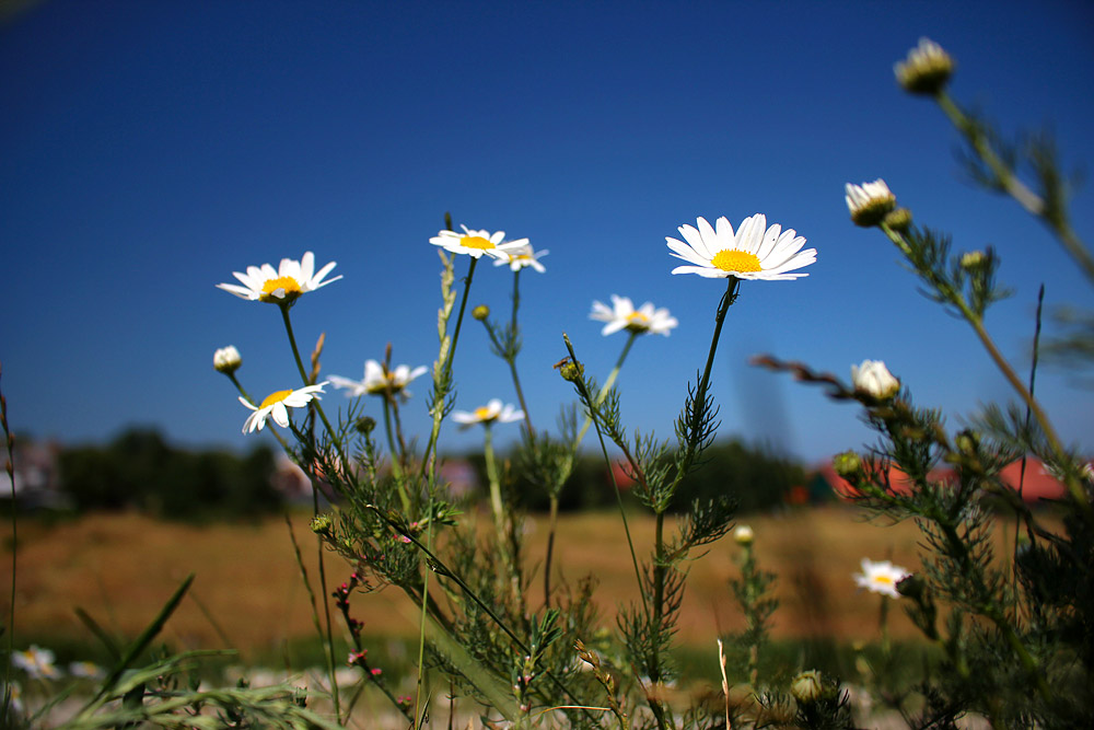 Im Kleiboden, der auf dem erhöhten Deich aufgebracht wurde, waren offensichtlich auch Samen der Geruchlosen Kamille bzw. Falschen Strandkamille enthalten. Jetzt Ende Juli blüht sie.
