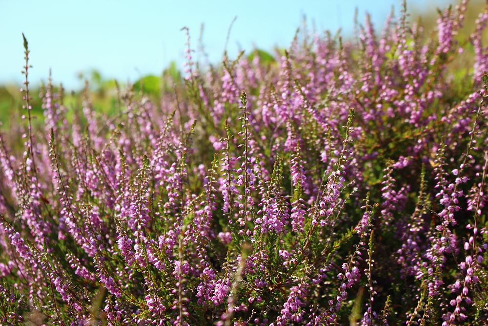 An zahllosen Stellen auf der Insel ist die rosa blühende Besenheide zu Haus. Beim Heidekraut handelt es sich übrigens – wer hätte es gewußt? – um die Blume des Jahres 2019.