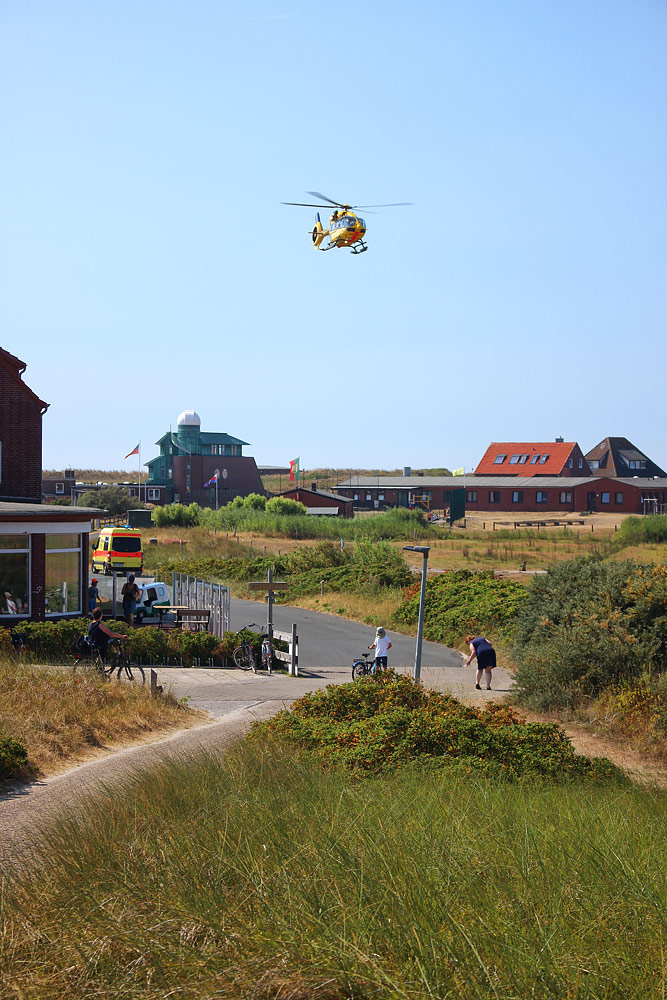 ‹ »Christoph 26« der ADAC Luftrettung im finalen Landeanflug. Die Weiden des Westinnengrodens stellen glücklicherweise einen ausreichend großen Landeplatz zur Verfügung, so daß die kranke oder verletzte Person nicht allzu weit transportiert werden muss.