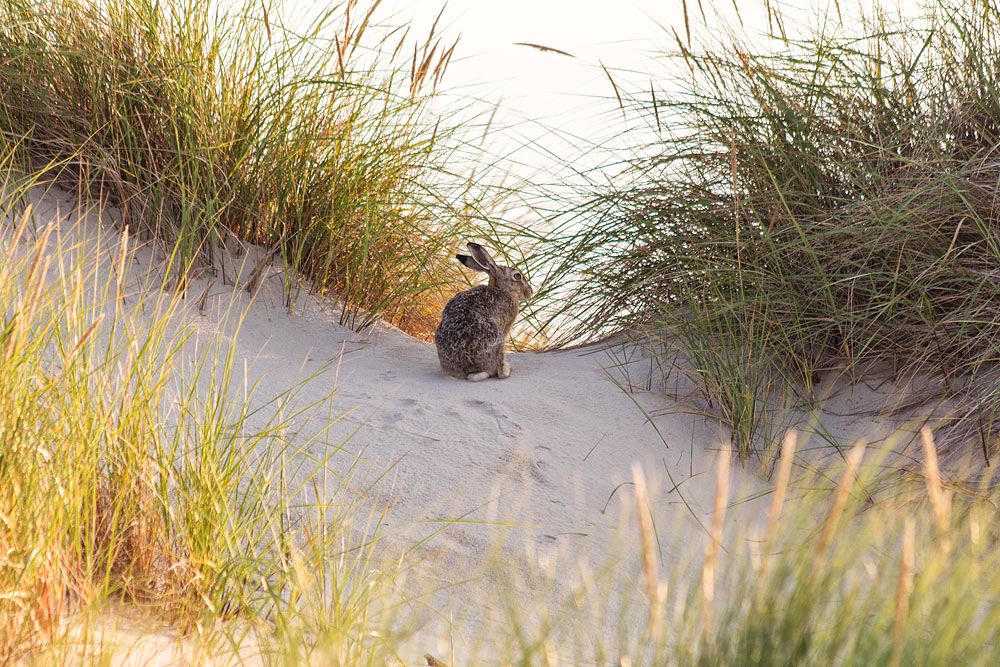 Dieser Hase sitzt im vorderen Bereich der Nordostdünen im Sand und spitzt seine Ohren.